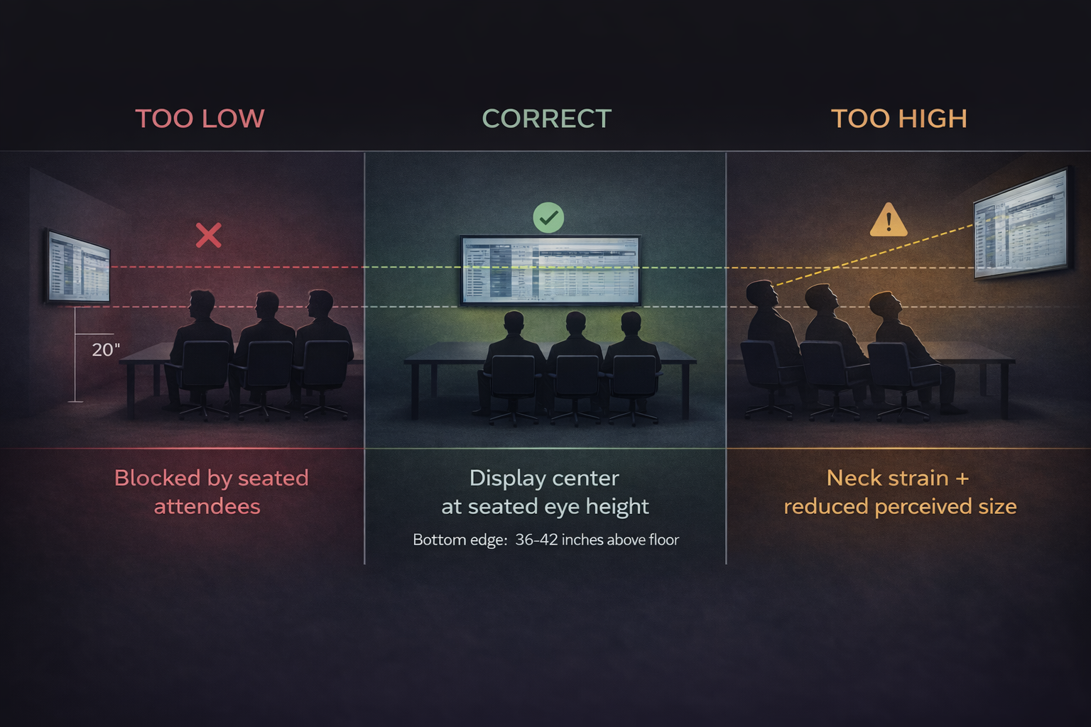A display mounted too high forces viewers to look up, creating neck strain and reducing effective viewing size. A display mounted too low gets blocked by people seated between the viewer and the screen.